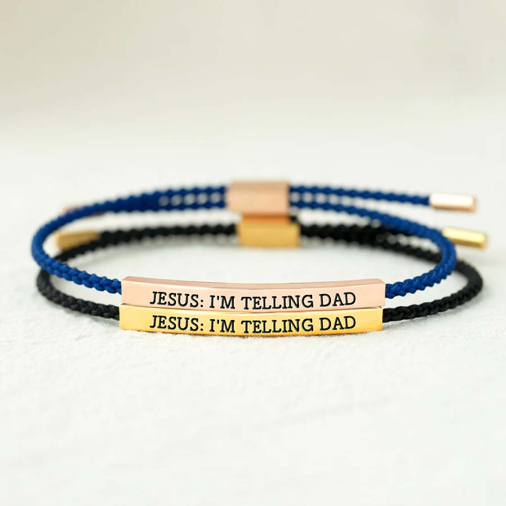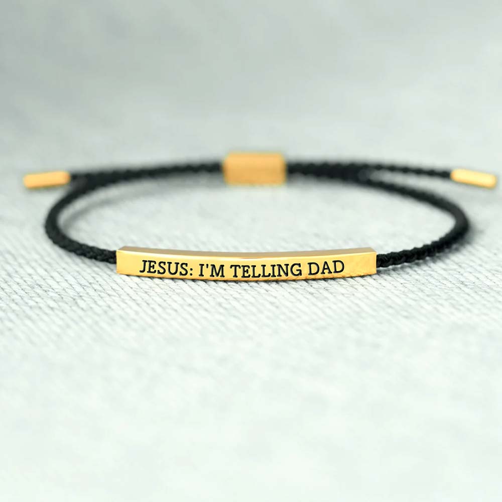 Add a touch of divine comedy to your style with the "Jesus: I'm Telling Dad" tube bracelet. Featuring a sleek metal bar engraved with this witty phrase, this piece is perfect for those who love blending faith with a sense of humor.